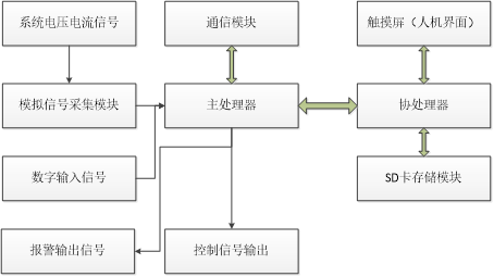本裝置由電源模塊,模擬信號采集模塊,數字信號輸入模塊,繼電器信號輸出模塊,開關量采集模塊,主處理器模塊,協(xié)處理器模塊,通信模塊,SD卡存儲模塊等部分組成,如圖: